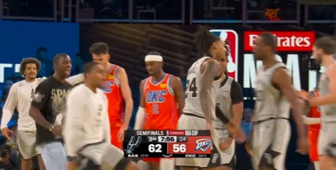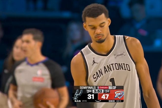 北京时间12月14日,NBA杯半决赛雷霆对阵马刺,文班亚马连续因伤缺席12场后复出,但NBA生涯首次担任替补。亚历山大引领雷霆在次节中段领先16分优势,文班亚马率领马刺团队攻势反扑在下半场反超比分,末节双方拉锯战交替领先。文班亚马最后时刻接连关键攻防表现,最终马刺以111-109逆转战胜雷霆收获3连胜。马刺队史首次晋级NBA杯决赛,将对决尼克斯争夺NBA杯冠军。雷霆结束队史最长与本赛季联盟最长的16连胜,雷霆遭遇本赛季第2败。雷霆:亚历山大29分4篮板5助攻,杰伦17分7篮板4助攻4抢断,霍姆格伦17分7篮板,哈尔滕施泰因10分8篮板,卡鲁索11分8篮板3助攻3抢断。马刺:文班亚马22分9篮板2盖帽,瓦塞尔4记三分23分5篮板4助攻,卡斯尔22分,福克斯3记三分22分4助攻。文班亚马时隔12场复出,且NBA生涯首次担任替补,他在首节未出战情况下,后三节用出色的攻防表现,率领马刺4人得分20+,惊险完成16分逆转终结雷霆16连胜,从而队史首次晋级NBA杯决赛。马刺核心文班亚马连续缺席12场后迎来复出,缺席期间马刺取得9胜3负战绩,但如今他是NBA生涯首次担任替补。雷霆五虎霍姆格伦、多尔特、哈尔滕施泰因、杰伦、亚历山大本赛季首次合体首发出战。保罗现身观战两大老东家对决。诺维茨基、纳什与格里芬等强大阵容解说,诺维茨基被问到和文班亚马1V1比赛谁能赢表示:“他会11-3赢我,他能封盖我的金鸡独立后仰。”文班亚马次节登场率队追到差4分,下场后立即被拉开落后16分差距。马刺下半场无文班亚马一波10-0攻势反超比分,全场首次领先雷霆。末节开局文班亚马正面大帽霍姆格伦。雷霆过去16场豪取16连胜创队史纪录,马刺过去两场连赢鹈鹕与湖人收获2连胜。本场首节开局,霍姆格伦三分命中全场首球,巴恩斯抛射命中,亚历山大与卡斯尔各得2分,雷霆多点开花一波9-0攻势扩大14-4领先,其中哈尔滕施泰因两度空接暴扣。瓦塞尔连得4分,亚历山大与霍姆格伦接连得分,巴恩斯再追2分,雷霆一波6-2扩大24-12领先优势。卡斯尔与凯尔登各中一记三分引领一波8-2攻势追分,雷霆再得5分,福克斯超远也是三分不中,首节结束雷霆31-20领先马刺。首节亚历山大10中5得到10分,文班亚马并未出战,巴恩斯三分6中0得到4分。次节比赛,文班亚马终于复出登场,文班亚马补篮得分,哈珀三分与两罚一中追分,杰伦中投回敬,尚帕尼三分追到差4分打停雷霆。文班亚马被换下场,雷霆趁机多点开花打出一波14-2攻势,扩大47-31领先优势打停马刺。文班亚马重新登场,巴恩斯与亚历山大各得2分,福克斯连续得分,文班亚马之后也命中三分,引领马刺打出一波13-0攻势追分。雷霆单节18-26被追回8分,上半场结束雷霆仅49-46领先马刺。前两节比赛,雷霆三分17中3,亚历山大12分,马刺三分26中6,文班亚马5+5+1+1+1。中场休息回来,马刺连续冲击内线追到仅差1分,杰伦三分回敬,卡斯尔三分与福克斯连得4分,瓦塞尔也命中三分,马刺一波10-0攻势反超6分打停雷霆。双方随后冲击内线各得4分,亚历山大三分与一条龙上篮追到仅差1分,马刺连得5分巩固优势。米切尔三分命中,文班亚马两罚全中,雷霆连得6分反超1分,福克斯三分回敬。杰林2+1命中,福克斯两罚全中,雷霆单节28-32再输4分,三节结束雷霆77-78被马刺反超1分。前三节比赛,亚历山大23分与霍姆格伦13+5,文班亚马7+8、瓦塞尔14分、卡斯尔16分与福克斯19分。末节比赛,文班亚马正面大帽霍姆格伦,文班亚马中投得分,杰伦造犯规撞倒摄影师两罚全中。福克斯三分与文班亚马中投扩大6分优势,雷霆一波8-2攻势追到87-87打停马刺。瓦塞尔三分命中,哈尔滕施泰因反篮命中,卡鲁索暴扣与上篮连得4分反超3分,卡斯尔抛射与暴扣连得4分夺回领先。雷霆造犯规4罚3中,文班亚马单臂空接暴扣,亚历山大继续中投得分,瓦塞尔三分反超1分打停雷霆。文班亚马两罚一中,杰伦三分反超,文班亚马中投回敬,双方接连三分不中,文班亚马被封盖。卡鲁索空篮不中,瓦塞尔造卡鲁索犯规两罚一中,文班亚马拼抢篮板造成亚历山大犯规两罚全中扩大4分优势。杰伦与文班亚马接连打铁,霍姆格伦造文班亚马犯规两罚全中,文班亚马被犯规两罚一中维持3分优势。亚历山大一条龙暴扣,卡斯尔被犯规两罚全中,雷霆连续两次请求暂停。福克斯战术犯规送霍姆格伦两罚一中,文班亚马被犯规两罚一中扩大3分优势,福克斯继续战术犯规送杰伦两罚全中。双方继续战术犯规,瓦塞尔两罚全中,杰伦故意两罚一中,卡鲁索补篮不中,最终马刺111-109逆转终结雷霆16连胜,马刺首次晋级NBA杯决赛将战尼克斯。(文/醉卧浮生)